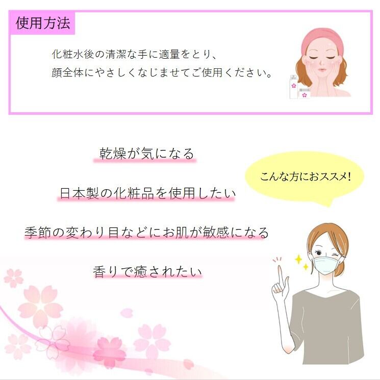 化粧水の後、手に適量をとり顔全体にやさしくなじませてご使用ください。